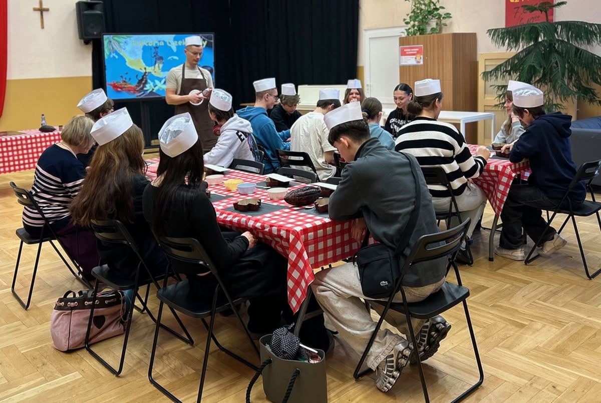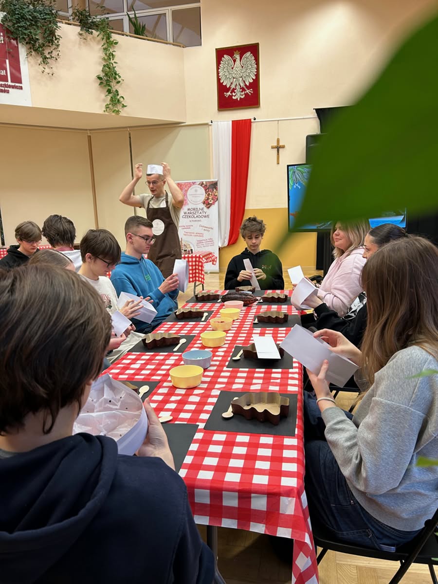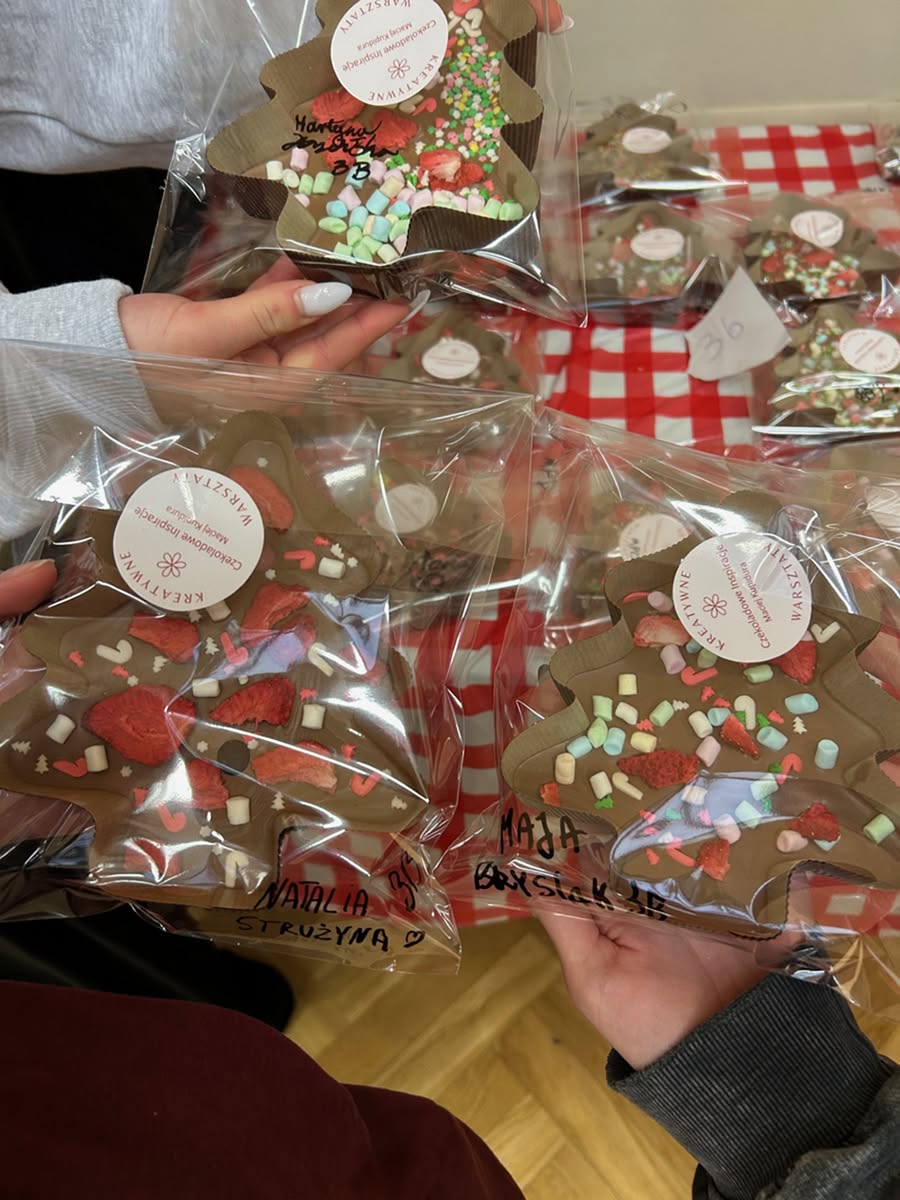 3 grudnia 2025 r. już w przedświątecznej atmosferze odbyły się dla wszystkich uczniów LO czekoladowe warsztaty. Były informacje o historii czekolady, była degustacja różnych rodzajów czekolady i oczywiście tworzenie własnej tabliczki czekolady – w kształcie choinki. Było ciekawie i słodko.