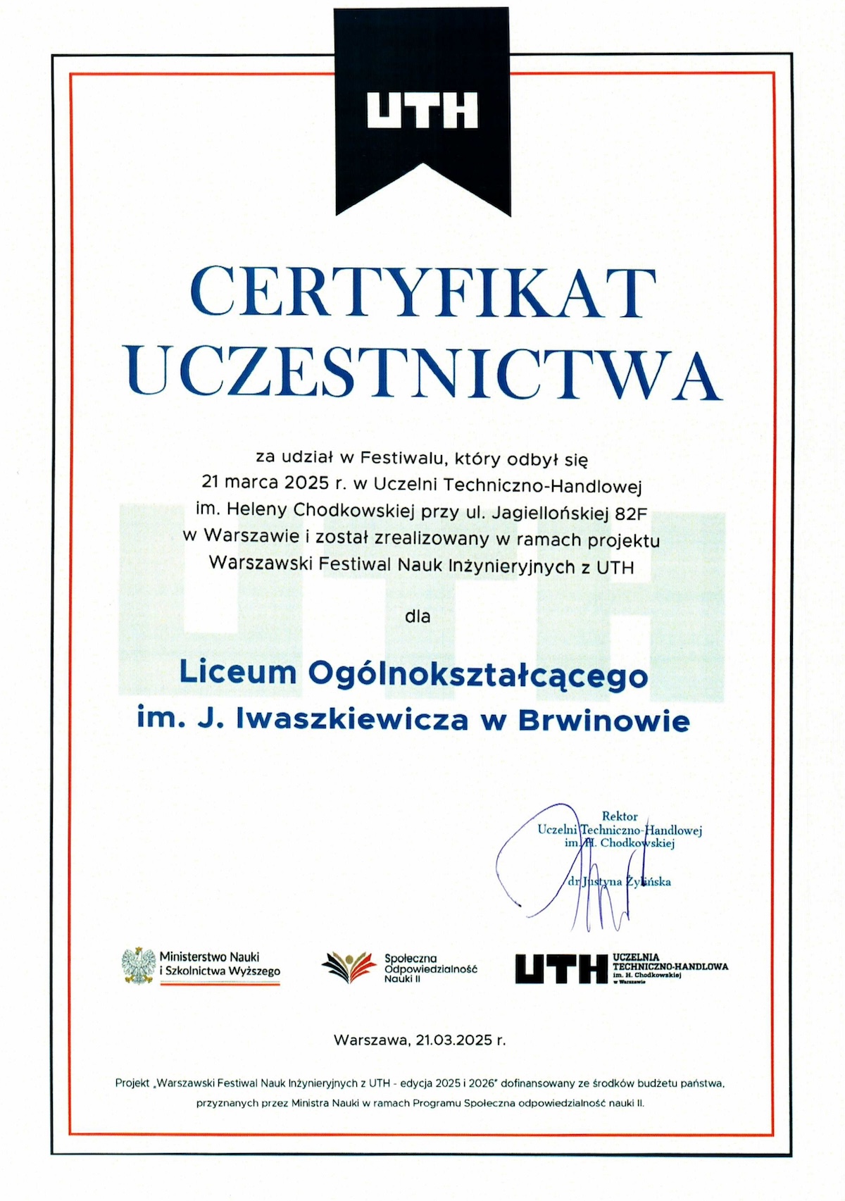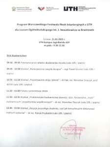 W dniu 21-go marca klasy 3a i 4a LO uczestniczyły w Warszawskim Festiwalu Nauk Inżynieryjnych na Uczelni Techniczno-Budowlanej im. Heleny Chodkowskiej w Warszawie.