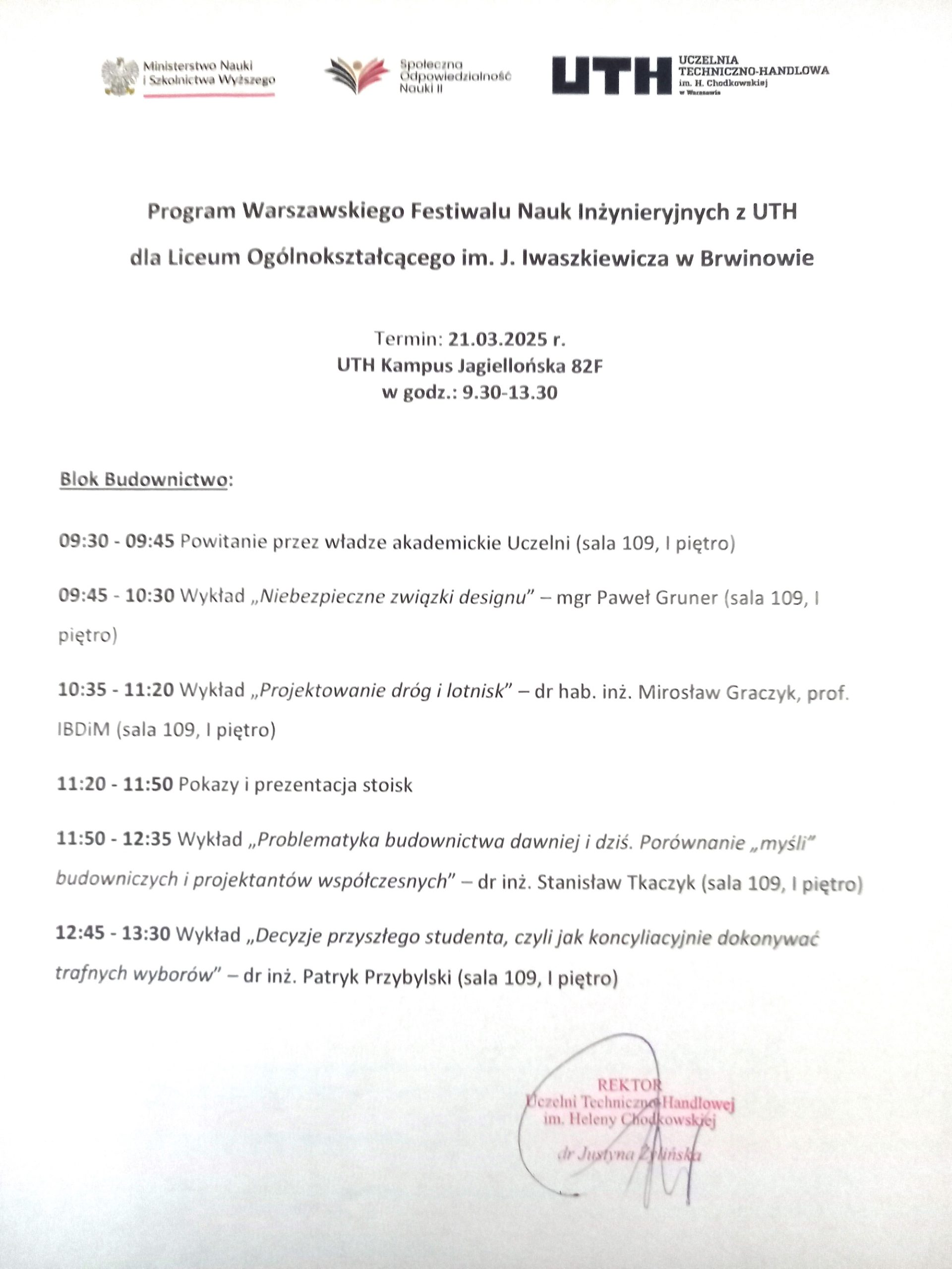 Podczas wydarzenia uczniowie mieli okazję poszerzyć swoją wiedzę z zakresu nowoczesnych technologii, inżynierii oraz budownictwa. Brali udział w wykładach prowadzonych przez ekspertów oraz pokazach innowacyjnych rozwiązań technicznych. Festiwal był doskonałą okazją do zapoznania się z przyszłymi kierunkami rozwoju inżynierii oraz możliwością dalszej edukacji w tych dziedzinach.