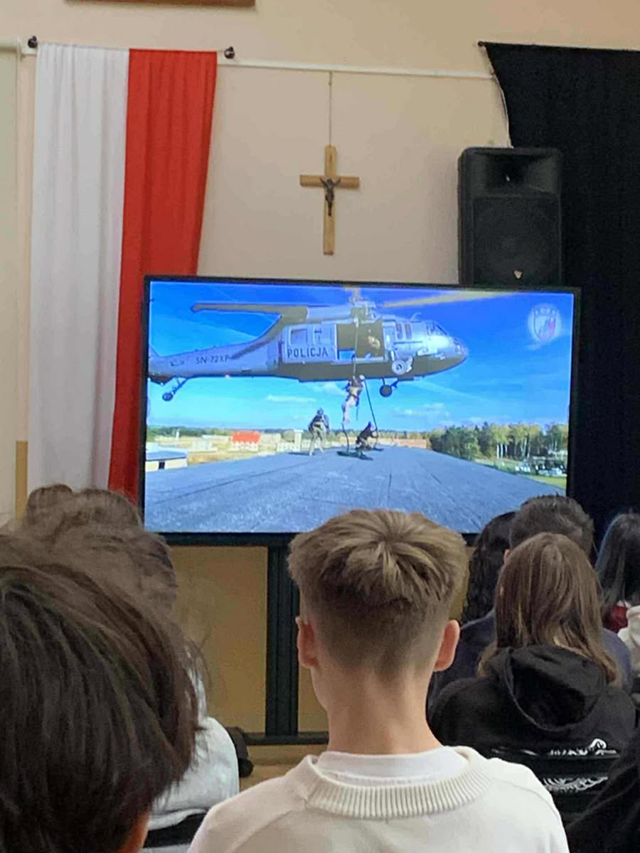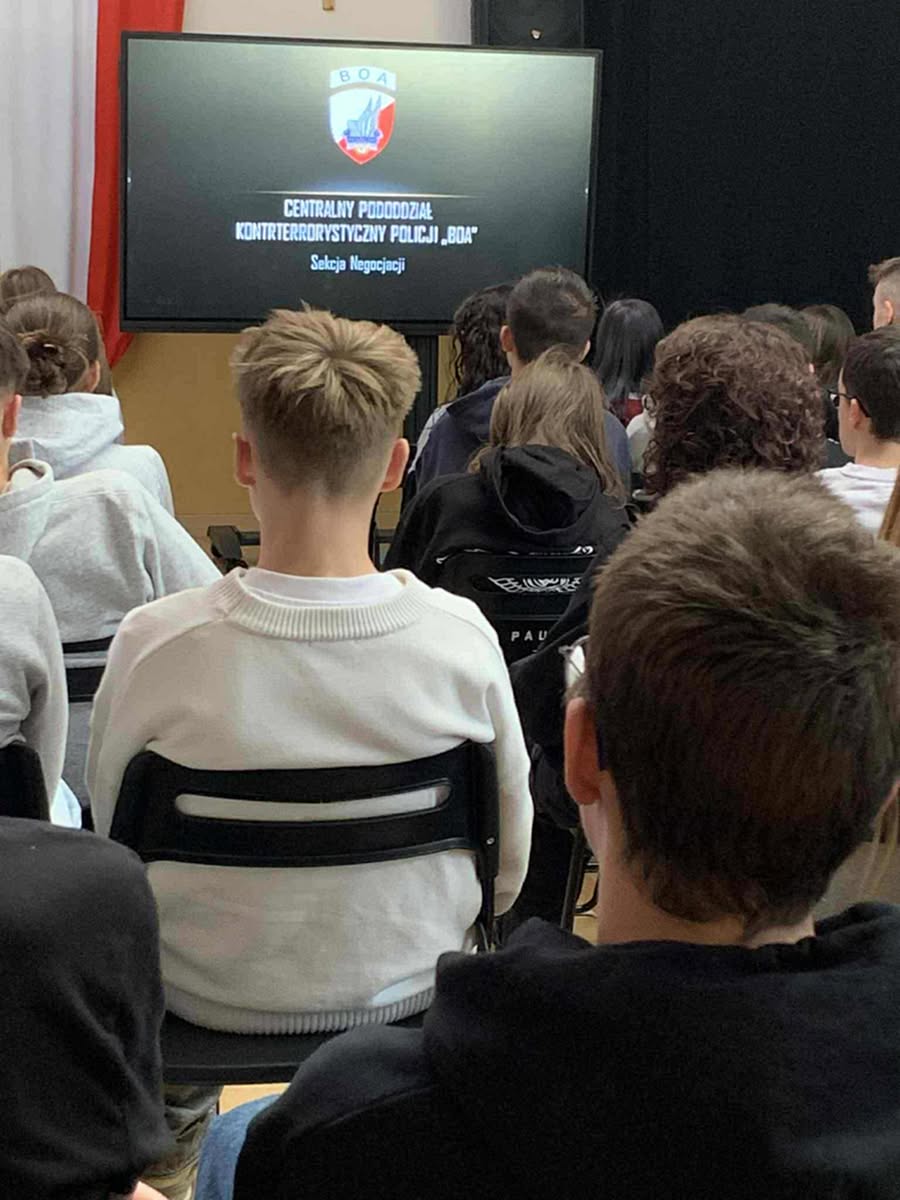 Centralnego Pododdziału Kontrterrorystycznego Policji. Klasy 8-me, I i II LO przeszły szkolenie dotyczące: „Współczesnych Zagrożeń”. Warsztaty trwały 4 h i były niezmiernie interesujące. Dowiedzieliśmy ⁦m.in⁩. o zasadzie 4U: Unikaj, Uciekaj, Ukryj się, Udaremnij.